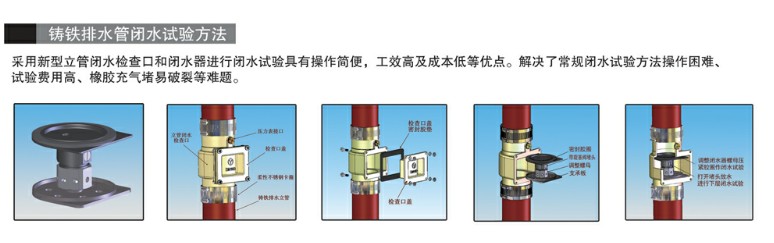 閉水檢查口是一種集排水管檢查和閉水試驗功能于一身的新型排水管件。它可以代替原有檢查口永久的安裝在排水管道中,當進行閉水試驗時,只需打開檢查口蓋,安裝上專用的帶有旋塞閥的閉水堵頭便可很方便的閉水檢查口進行閉水試驗。