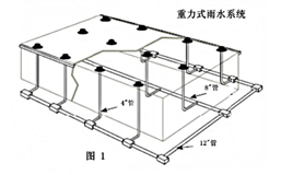 傳統(tǒng)重力式雨水系統(tǒng),是由雨水斗和垂直落水管網(wǎng)組成的。雨水斗收集的雨水通過垂直落水管排至地下排水管網(wǎng)中。為保證雨水順利流至排水管網(wǎng),這種傳統(tǒng)重力式雨水系統(tǒng)結(jié)構(gòu)所需的排水管管徑往往比較大,且與其相連的地下管網(wǎng)的管徑也比較大。這主要是由于系統(tǒng)內(nèi)處于恒定的大氣壓力(見圖2) ,雨水只靠垂直管道水落差產(chǎn)生的動力和水平管道的坡度流動。順著垂直落水管像瀑布一樣下流的雨水在水平管道內(nèi)產(chǎn)生翻騰(見圖2) ,這樣即便是在最大降雨量的情況下,水平管內(nèi)也有超過橫截面積1/2的空間充滿了空氣。也就是說,若能排除空氣,相同的水量只需傳統(tǒng)重力式雨水系統(tǒng)1/2的管道截面積就能排出。由于傳統(tǒng)重力式雨水系統(tǒng)無法除去空氣,提高其排水能力受到很大的限制。加之其流速低,雨水中夾帶的固體顆粒物容易在水平管道中沉積。這種雨水系統(tǒng)的低效率是由其結(jié)構(gòu)造成的,特別是安裝在大跨度的建筑屋面上,上述的缺陷顯得更為突出。